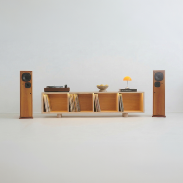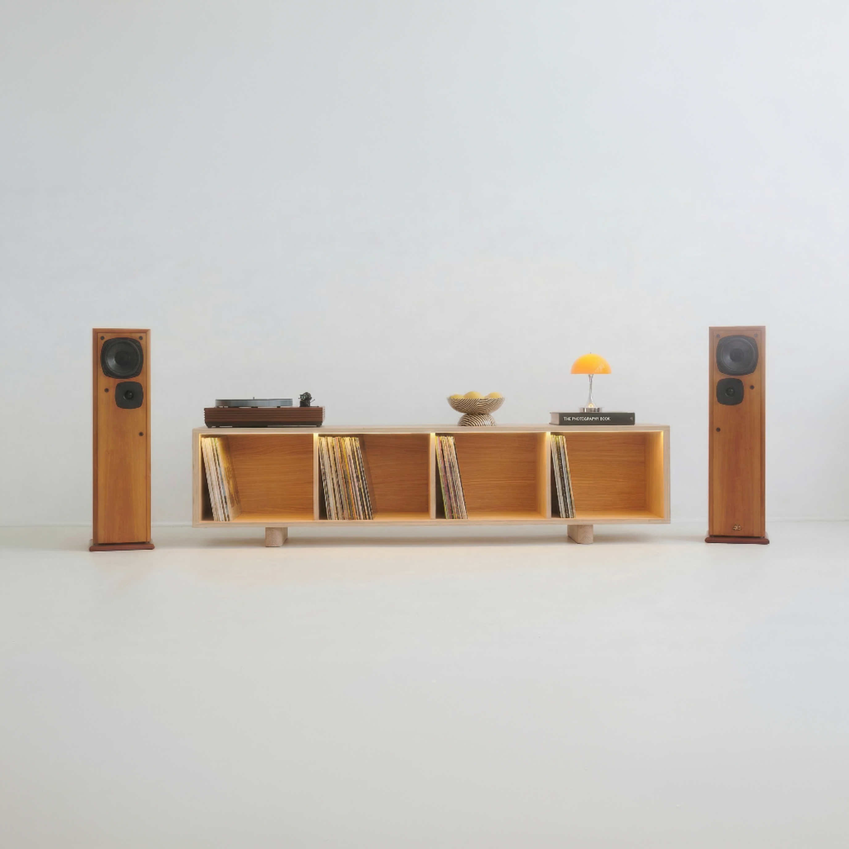 Handcrafted Hi-Fi stand with vinyl storage and optional dimmable LED lighting, designed to showcase your record collection while creating the perfect atmosphere for listening.
