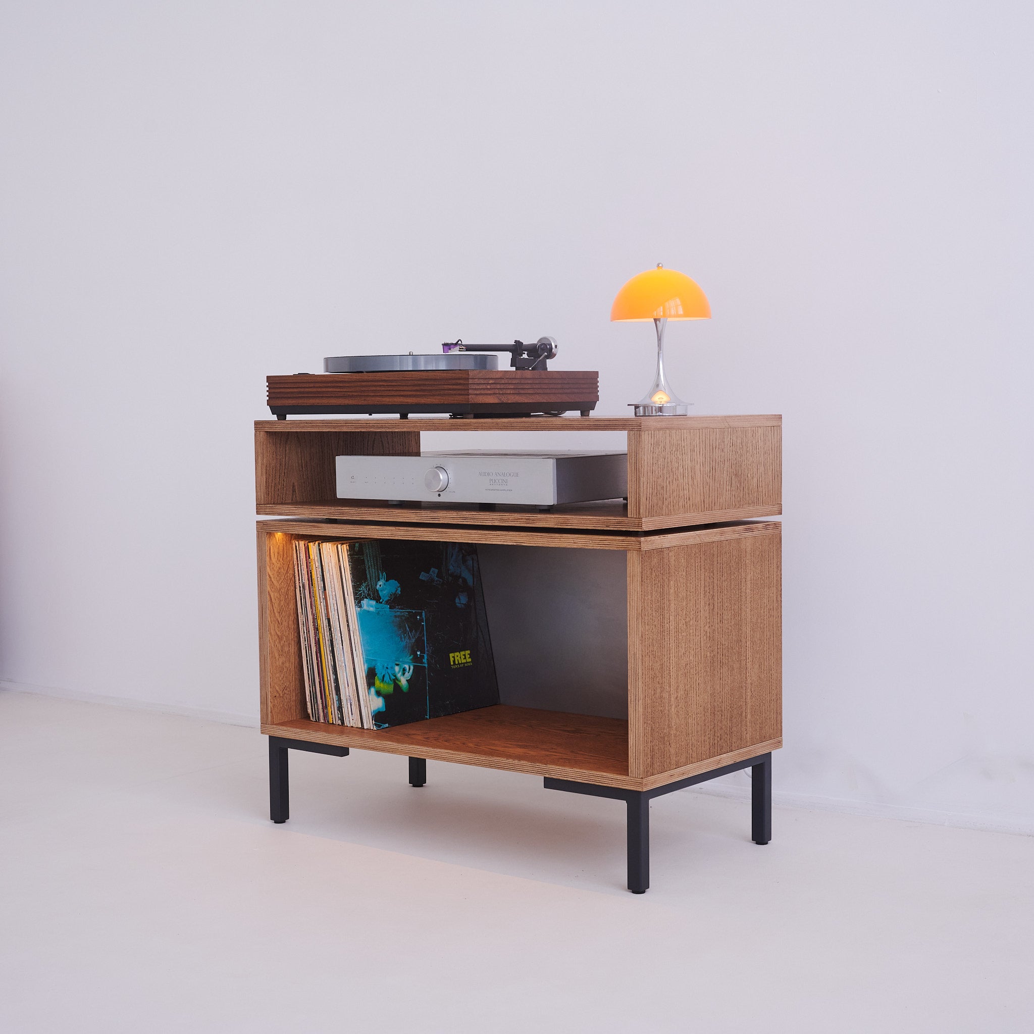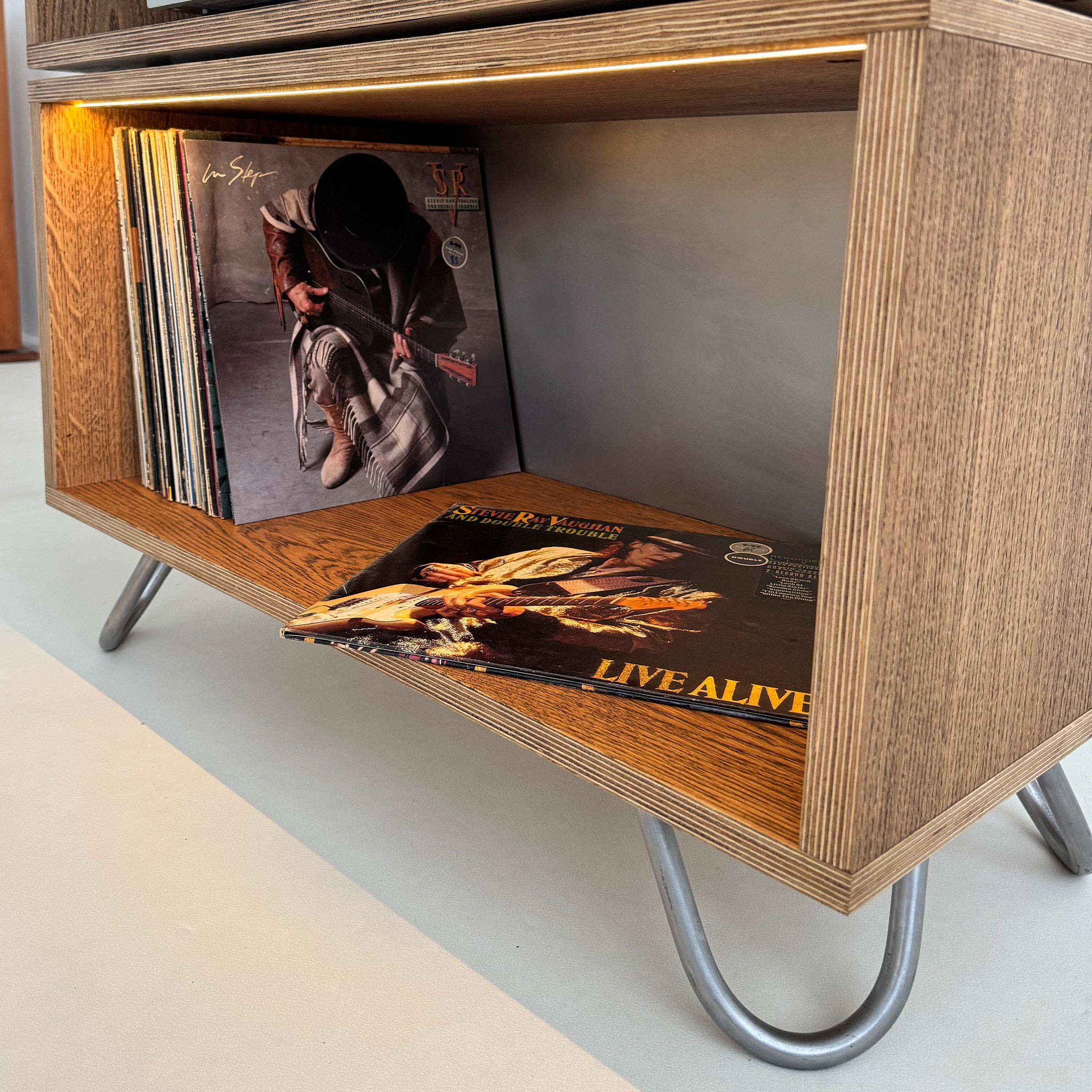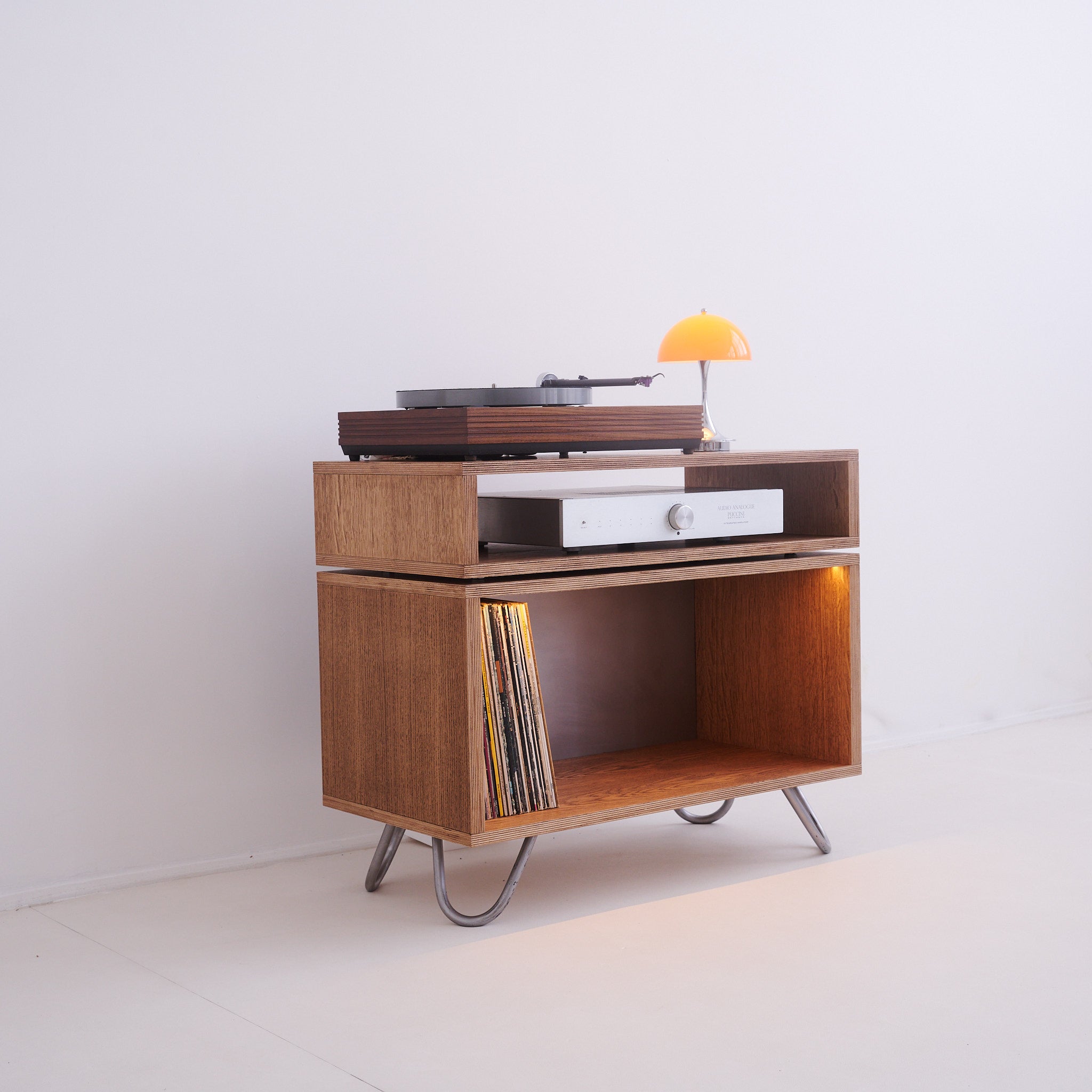 Handcrafted Hi-Fi stand with vinyl storage and optional dimmable LED lighting, designed to showcase your record collection while creating the perfect atmosphere for listening.