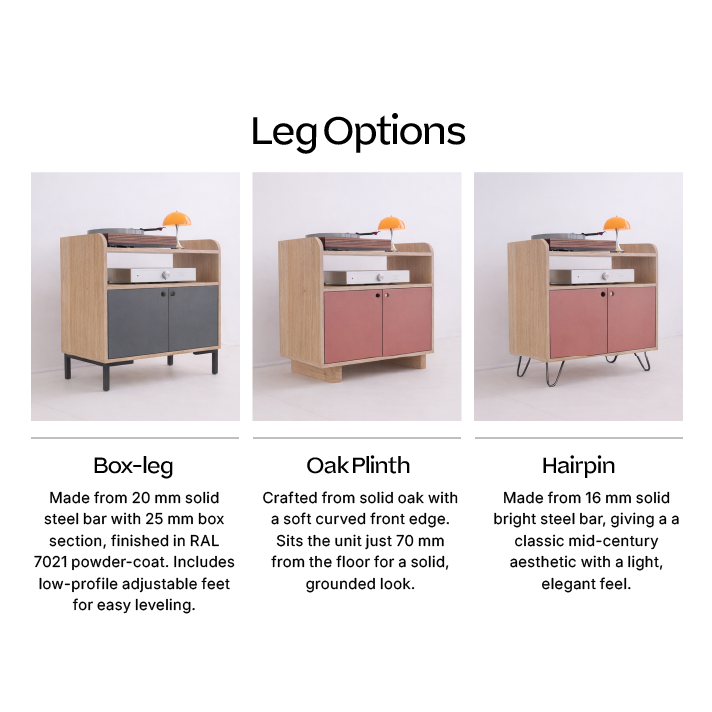 Each unit is designed and built in our Bristol workshop, with all wood and metalwork completed in-house. This allows us to offer a range of base styles, backing options and custom configurations.